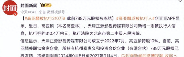 据天眼查等平台显示,高亚麟名下新增一条执行信息,执行金额达310.4万元,关联公司为其持股的天津正源影视有限公司。