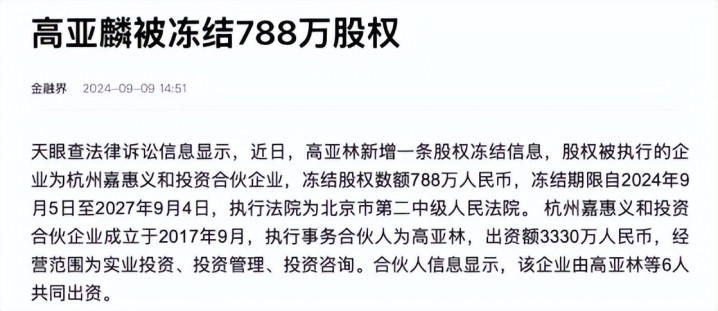 此外,其个人持有的多项股权被冻结,其中包括杭州某影视公司冻结金额合计接近800万元。